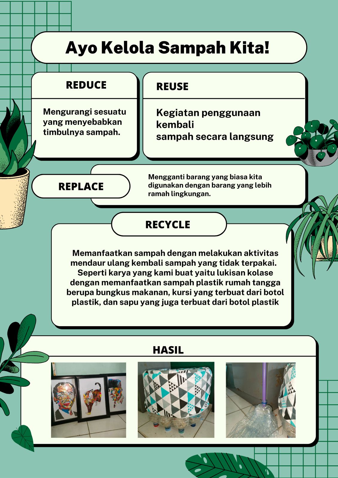 Pemanfaatan Daur Ulang Sampah Plastik Menjadi Karya Seni Lukisan, Bangku Dan Sapu